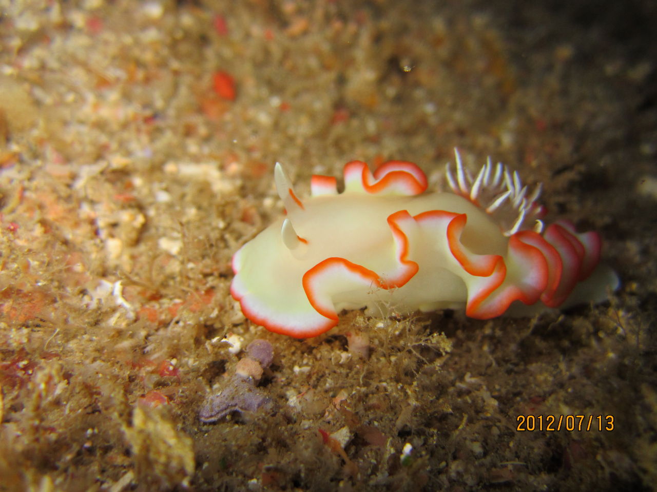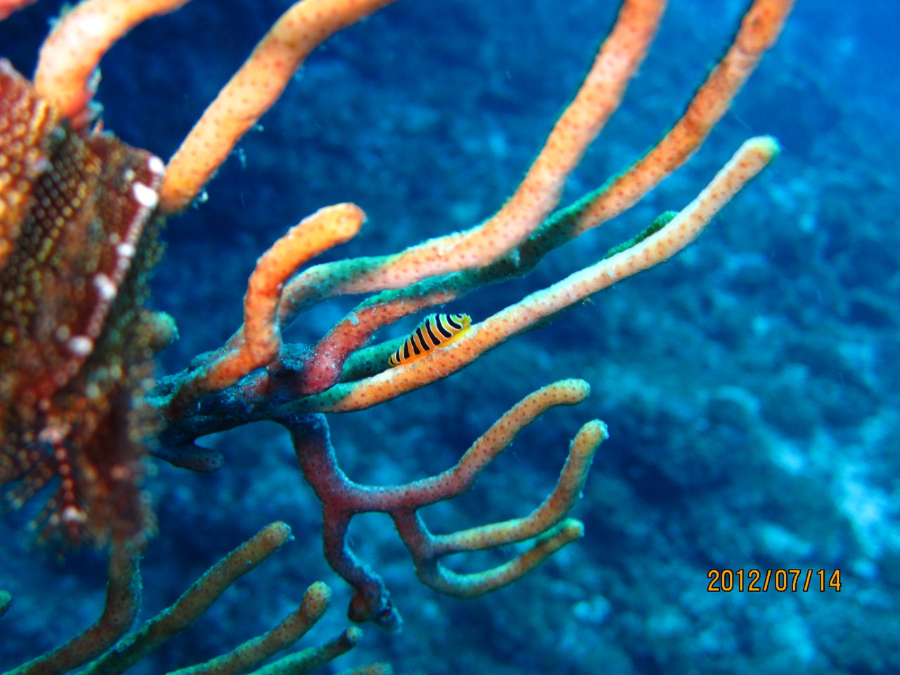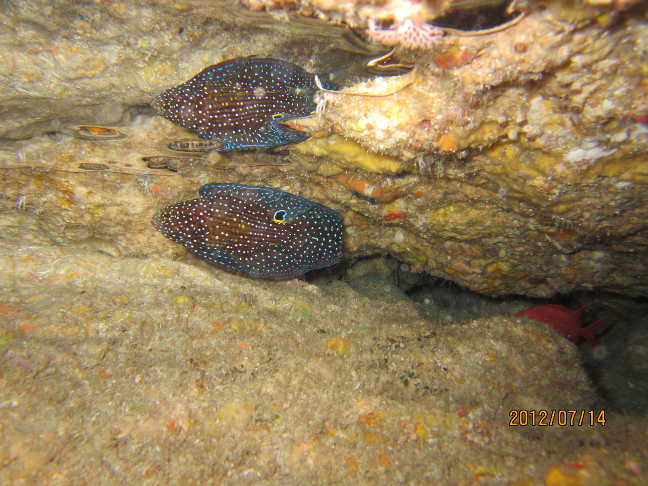 この2日間、南風なんだけど西からのうねりが強く、いつものポイントに行けず、だけども思わぬところで思わぬ収穫が得られました。13日、カミソリウオは、少しずつ大きくなってきています。フチベニイロウミウシは、動き回っているため、今日はどこに行っているのか? 見つかりませんでした。14日、シモフリ君は、ペアじゃないんですよー。実は、洞窟の上に溜まっている空気溜りに同じ個体が写っているものなんです。トラフケボリタカラガイは、普段あんまり通らないところで偶然見付けました。たまに違うコースを通ってみるのも、新たな発見があって面白いですねー。カマスの群れは、小物を探して、ずっと下を見ていて、何気なく上を見上げたら、いつのまにか近くに来ていて、ビックリしましたー。この連休、明日はどんなものが見られるかなあ・・・。