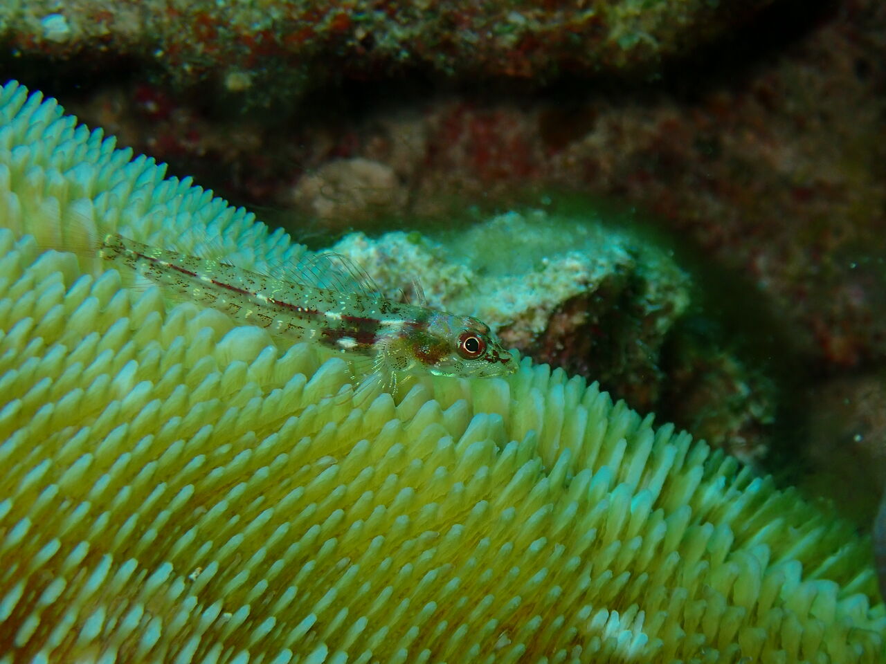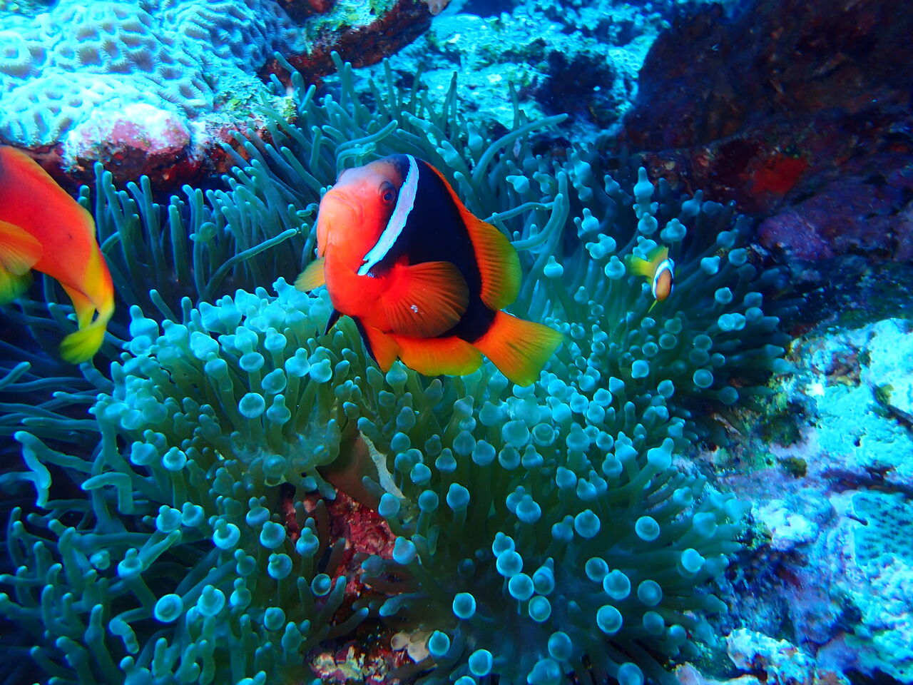 1本目はハナゴンベ、イロブダイの幼魚、オヨギハゼ、スジアラ、ハマクマノミ、ハナビラクマノミなどが見れました。
